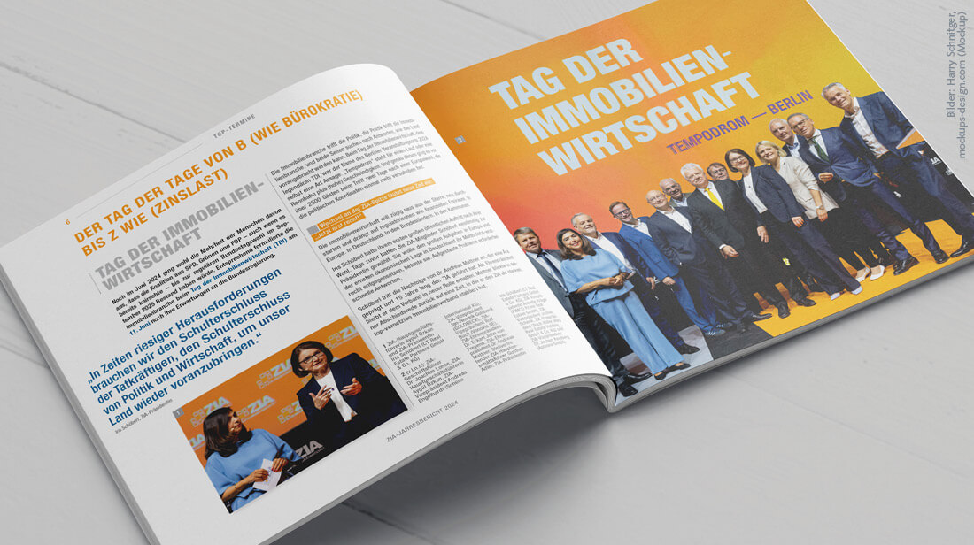 KONTURENREICH hat das neue Gestaltungskonzept für den Jahresbericht des Zentralen Immobilien Ausschuss (ZIA) entwickelt und ihn bis hin zu Produktion und Druck umgesetzt. Ansprechende Opener-Seiten trennen die unterschiedlichen Kapitel voneinander. Es galt besonders, die zahlreichen Events des Verbands mit den namhaften Gästen, attraktiv darzustellen. Dazu bietet das Gestaltungraster optimal die Möglichkeit, die zahlreichen Bilder und Statements abwechslungsreich zu platzieren. Zusätzlich zur Print- gibt es auch eine interaktive Online-Version, die eine intutive Nutzerführung ermöglicht.