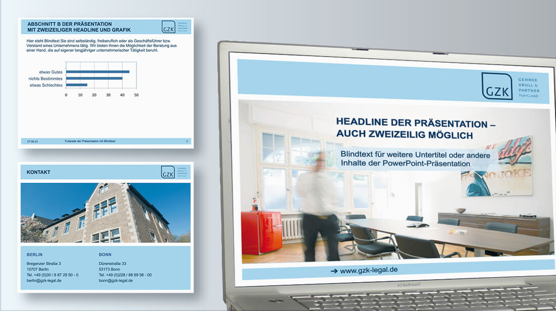 Je nach Aufgabenstellung überarbeiten wir aber auch Ihre bestehenden PowerPoint-Dateien und erstellen eine neue Präsentation. Dabei achten wir auf die einheitliche Verwendung von Schriften, einen einwandfreien typografischen und lesefreundlichen Satz sowie schöne und stilvolle Grafiken. Als Alternative und zur Auflockerung textlastiger Charts schlagen wir Ihnen ein Bildkonzept vor, das Ihre Kernaussagen unterstützt und Ihren Zuhörern gut in Erinnerung bleibt.